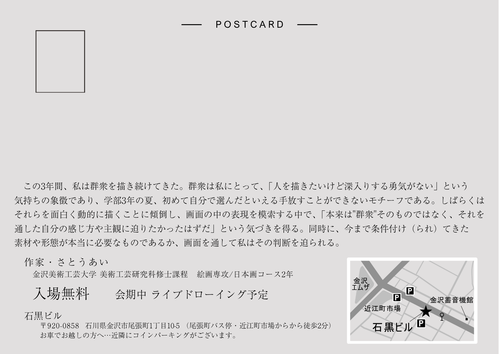●場所:石黒ビル(尾張町バス停・近江町市場から徒歩2分) 〒920-0902 石川県金沢市尾張町1丁目10−5