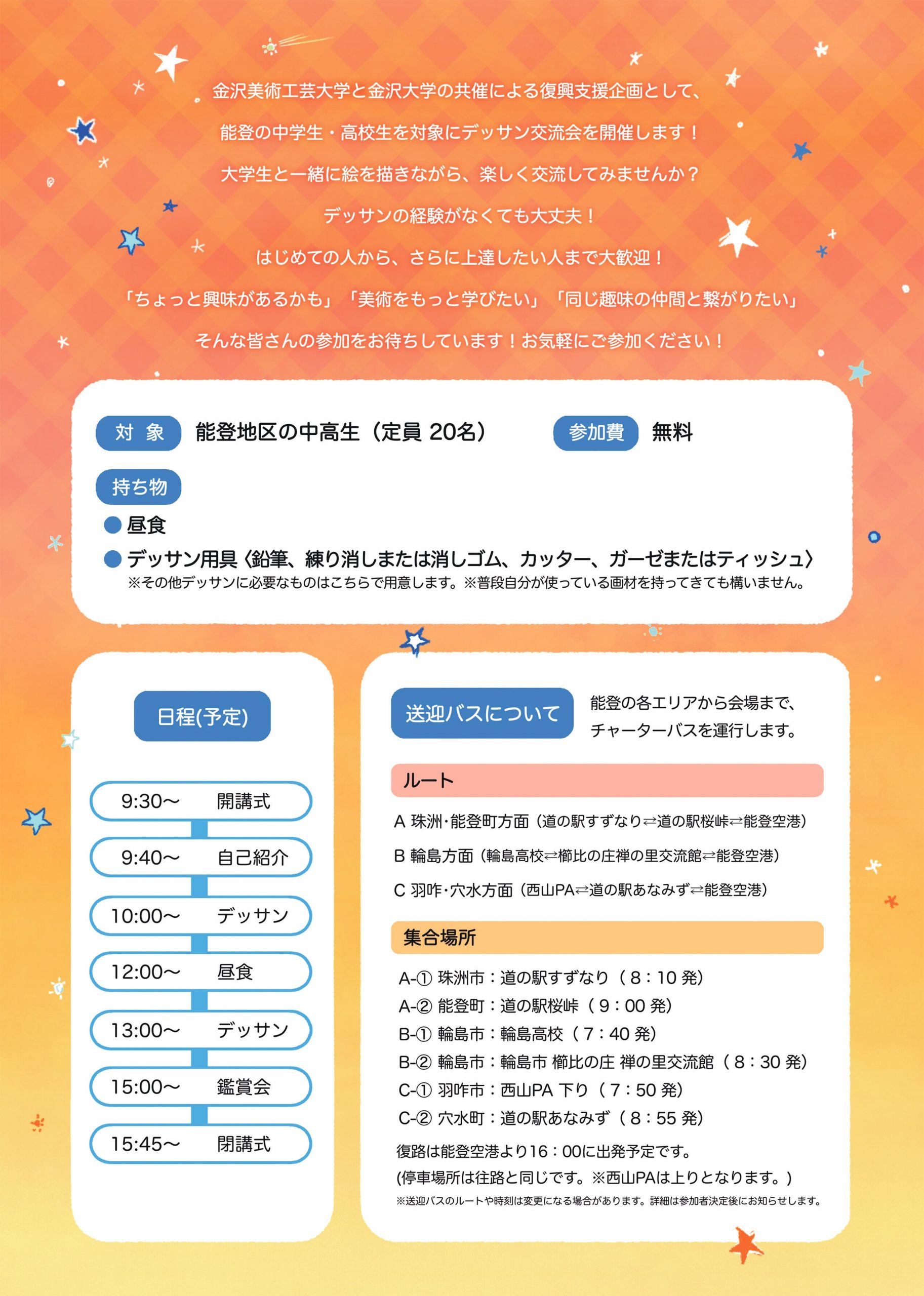 金沢美術工芸大学は金沢大学と連携して、能登復興支援の一環として下記の通り 能登の中学生と高校生を対象に、