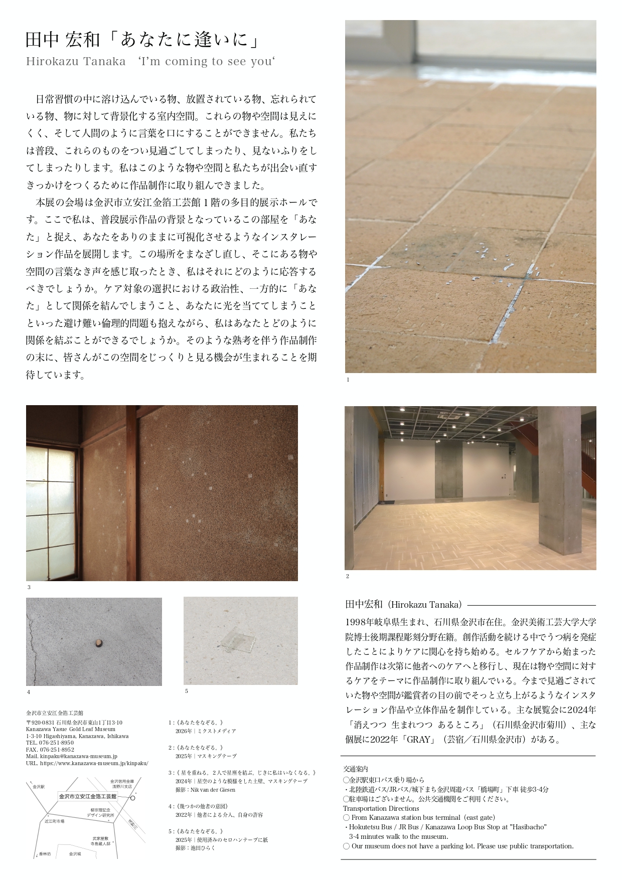 本展の会場は金沢市立安江金箔工芸館1階の多目的展示ホールです。ここで私は、普段展示作品の背景となっているこの部屋を「あなた」と捉え、あなたをありのままに可視化させるようなインスタレーション作品を展開します。この場所をまなざし直し、そこにある物や空間の言葉なき声を感じ取ったとき、私はそれにどのように応答するべきでしょうか。ケア対象の選択における政治性、一方的に「あなた」として関係を結んでしまうこと、あなたに光を当ててしまうことといった避け難い倫理的問題も抱えながら、私はあなたとどのように関係を結ぶことができるでしょうか。そのような熟考を伴う作品制作の末に、皆さんがこの空間をじっくりと見る機会が生まれることを期待しています。